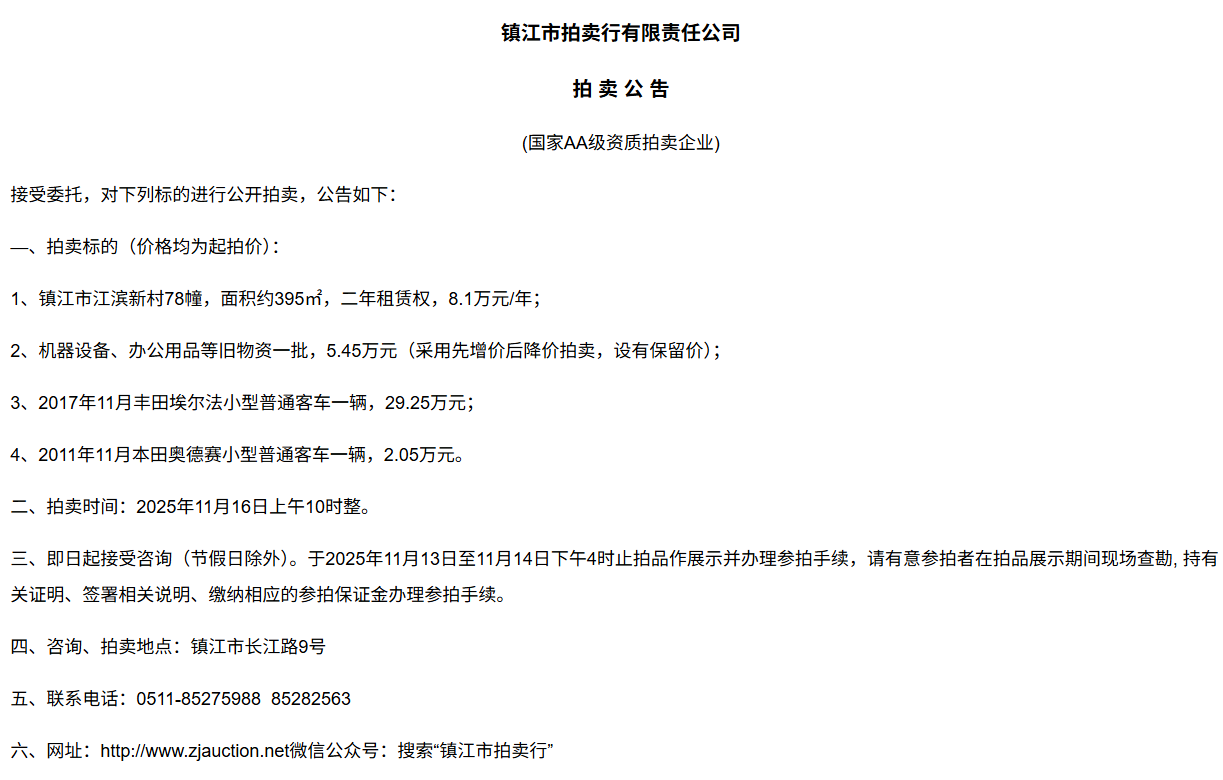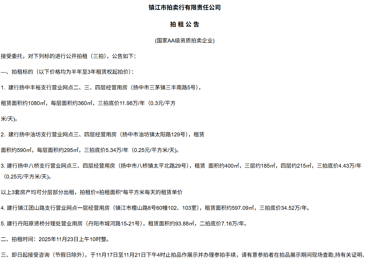 鎮江市拍賣行有限責任公司拍 租 公 吿(國家AA級資質拍賣企業)接受委托,對下列標的進行公開拍租(三拍),公告如下:—、拍租標的(以下價格均為半年至3年租賃權起拍價):1.  建行揚中豐裕支行營業網點二、三、四層經營用房(揚中市三茅鎮三豐南路5號),租賃面積約1080㎡,每層面積約360㎡,三拍底價11.98萬/年(0.3元/平方米/天)。2.  建行揚中油坊支行營業網點三、四層經營用房(揚中市油坊鎮太陽路129號),租賃面積約590㎡,每層面積約295㎡,三拍底價5.34萬/年(0.25元/平方米/天)。3. 建行揚中八橋支行營業網點三、四層經營用房(揚中市八橋鎮太平北路29號),租賃  面積約400㎡,三層約185㎡,四層約215㎡,三拍底價4.43萬/年(0.25元/平方米/天)。以上3套房產均可分層部分出租,拍租價=拍租面積*每平方米每天的租賃單價4. 建行鎮江團山路支行營業網點一層經營用房(鎮江市檀山路8號60幢102、103室),租賃面積約597.09㎡,三拍底價34.52萬/年。5. 建行丹陽原賢橋分理處營業用房(丹陽市城河路15-21號),租賃面積約93.88㎡,二拍底價7.16萬/年。二、拍租時間:2025年11月23日上午10時整。三、即日起接受咨詢(節假日除外)。于11月17日至11月21日下午4時止拍品作展示并辦理參拍手續,請有意參拍者在拍品展示期間現場查勘,持有關證明、簽署相關說明、繳納相應的參拍保證金辦理參拍手續。四、咨詢、拍租地點:鎮江市長江路9號五、聯系方式:0511-85275988   13655299933楊先生六、網址:http://www_zjauction_net.zjkgy.cn;微信公眾號:搜索“鎮江市拍賣行” 拍品清單2025.11.23序號名稱起拍價(元)標的說明1建行揚中豐裕支行營業網點二、三、四層經營用房(揚中市三茅鎮三豐南路5號),租賃面積約1080㎡,每層面積約360㎡三拍底價11.98萬/年(0.3元/平方米/天)1、1-3號房產均可分層部分出租,拍租價=拍租面積*每平方米每天的租賃單價;2、意向競拍人在拍賣前需持營業執照或身份證與委托方說明租賃房產經營業態,確定意向后出具房產承租用途承諾書,經委托方審核后,方可交納保證金參加競拍;3、租賃期限為半年至3年(承租方與出租方協商而定),承租方每半年或一年結付租金,租賃期間的水、電費用及其它相關費用均由承租方承擔;4、承租方不得用于經營和保管危險物品,不得用于開設餐飲、娛樂等可能嚴重影響消防安全、運營安全的經營業態,不得用于經營委托貸款、小額貸款等可能冒用委托方名義,帶來聲譽風險的經營業態。租賃期內,承租方不得破壞墻體結構,自行成就消防、安全等使用條件,不得擅自將租賃房屋轉租、轉讓給他人使用,否則委托方有權收回房屋;5、拍租成交后,承租方將租金交至出租方指定賬戶,傭金交至拍賣方賬戶(拍租傭金為該房屋一個月租金)。承租方憑租賃合同無息退還保證金。2建行揚中油坊支行營業網點三、四層經營用房(揚中市油坊鎮太陽路129號),租賃面積約590㎡,每層面積約295㎡三拍底價5.34萬/年(0.25元/平方米/天)3建行揚中八橋支行營業網點三、四層經營用房(揚中市八橋鎮太平北路29號),租賃面積約490㎡,每層面積約245㎡三拍底價4.43萬/年(0.25元/平方米/天)4建行鎮江團山路支行營業網點一層經營用房(鎮江市檀山路8號60幢102、103室),建筑面積約597.09㎡三拍底價34.52萬/年5建行丹陽原賢橋分理處營業用房(丹陽市城河路15-21號),建筑面積約93.88㎡二拍底價7.16萬/年